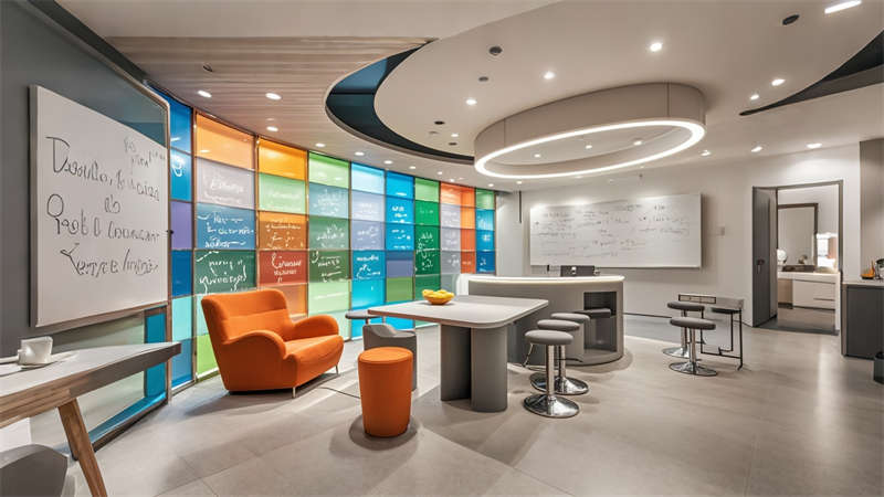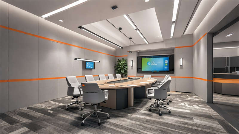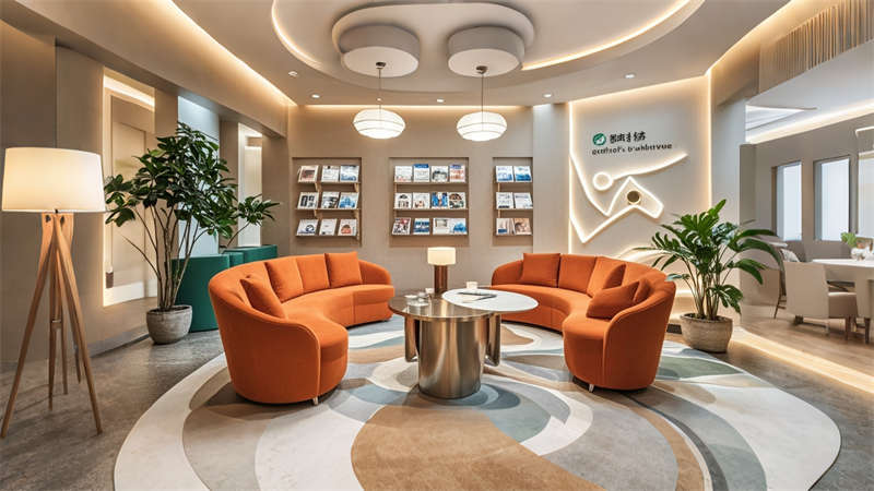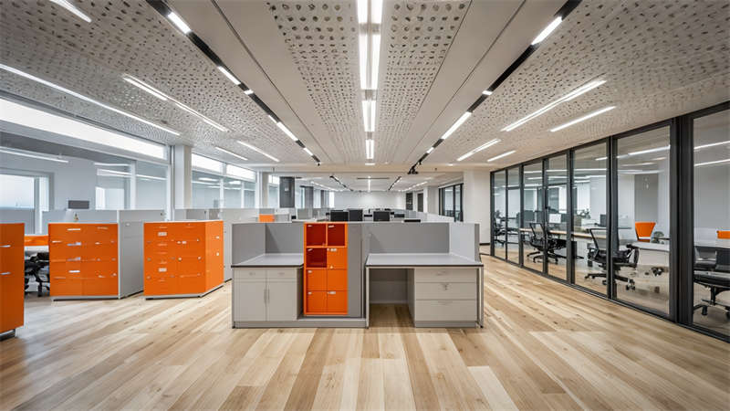 本項目為1800㎡現代簡約風格辦公室整體設計,以 ' 高效?活力?互聯 ' 為核心設計理念??臻g規劃采用動靜分區原則,前廳通過淺灰大理石與橙色 logo 的碰撞凸顯企業形象,開放辦公區運用玻璃隔斷保證采光與交流效率。色彩體系以企業標準色淺灰為主調,搭配活力橙點綴,木色中和冷峻感。材質選用環保型穿孔鋁板、防滑地磚和 E0 級板材,集成智能會議系統和隱藏式線管設計。重點空間如高管辦公室采用深胡桃木提升質感,休息區通過波浪吊頂和模塊沙發營造輕松氛圍。照明系統采用 4000K 色溫 LED 線型燈帶,搭配局部裝飾吊燈,確保工作照度與空間美感平衡。全案貫徹人體工學設計,預留 20% 彈性空間適應未來發展需求。