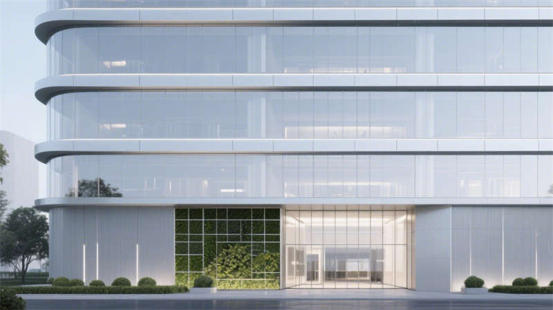 建筑外立面以流線型玻璃幕墻與啞光金屬線條勾勒科技輪廓,底部垂直綠植墻與光伏玻璃的融合,將生態(tài)可持續(xù)理念嵌入第一視覺印象。通透的挑高入口與室內(nèi)大堂形成光影聯(lián)動(dòng),淺白色大理石地面、懸浮式線性燈光與深藍(lán)色企業(yè)LOGO墻,以克制的色彩系統(tǒng)傳遞品牌調(diào)性,同時(shí)通過數(shù)字屏顯墻實(shí)現(xiàn)空間敘事動(dòng)態(tài)化。