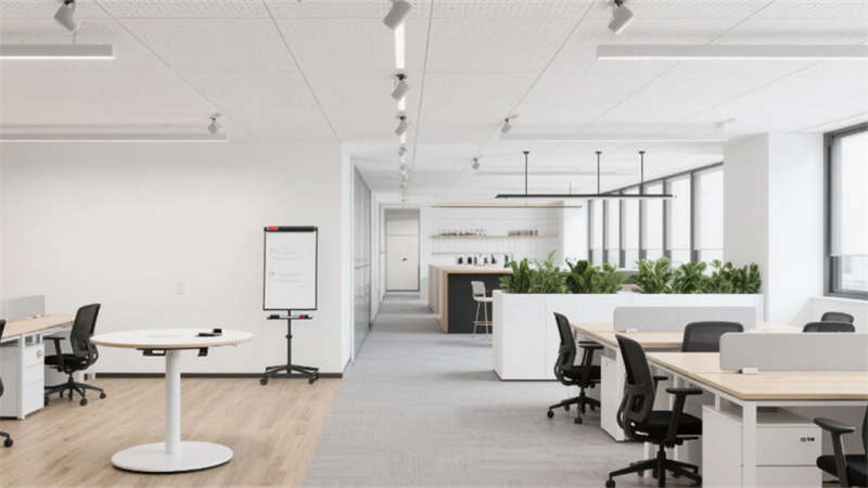 室內(nèi)空間延續(xù)外立面設(shè)計(jì)語言,企業(yè)大堂通過技術(shù)創(chuàng)新實(shí)現(xiàn)淺白大理石與木紋墻面的無縫拼接,懸浮式線性燈光系統(tǒng)可隨自然光線智能調(diào)節(jié)色溫。開放式辦公區(qū)配置智慧化模塊組合,可升降桌體與軌道射燈靈活適配多元場景,協(xié)作島集成無線充電與環(huán)境感知功能。高管辦公室采用智能霧化玻璃隔斷,實(shí)現(xiàn)隱私與通透的自由切換。科技會(huì)議室搭載高清透明顯示系統(tǒng)與多聲道聲學(xué)設(shè)備,電動(dòng)百葉簾與補(bǔ)光系統(tǒng)聯(lián)動(dòng)打造智能會(huì)議環(huán)境。