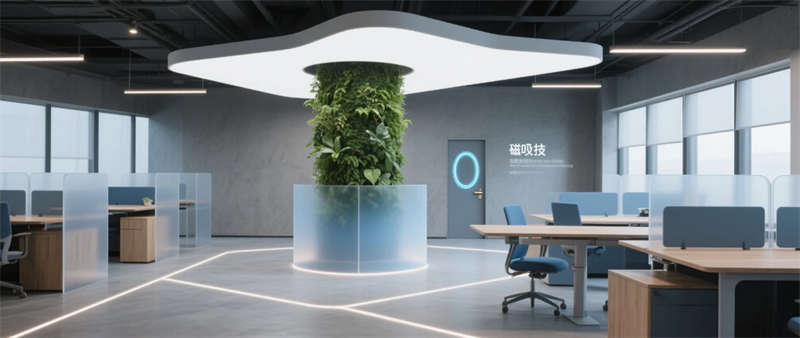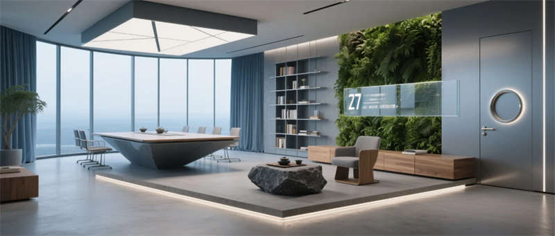 本項目以“未來生態辦公”為核心理念,打造1200㎡科技與自然交融的創新型辦公空間。設計采用啞光太空灰為主基調,通過霧霾藍企業色原木紋理的碰撞,在冷峻科技感中注入人文溫度。空間以微水泥地面為基底,貫穿透光亞克力陽極氧化鋁材質,配合隱藏式線性燈帶的流動光影,構建出具有呼吸感的數字美學場域。
