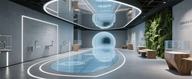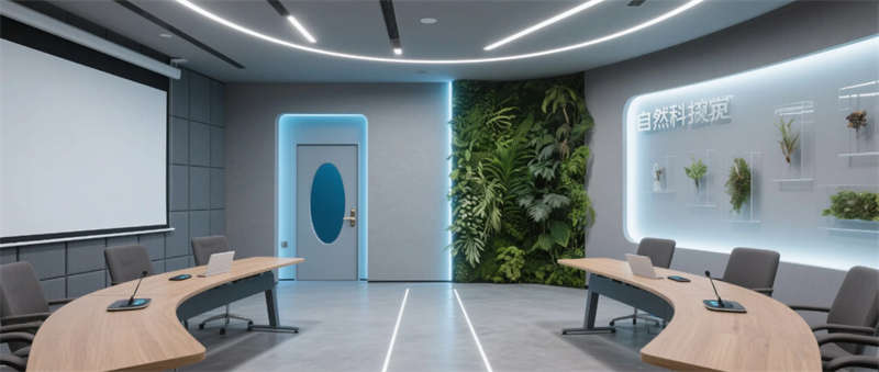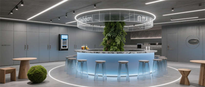 各區域通過四大統一性語言緊密串聯:霧霾藍橢圓金屬門把手貫穿全空間,再生材料家具呼應可持續發展理念,聲學墻面嵌入本地植物標本強化生態屬性,智能燈光系統則通過4000K色溫線性燈帶實現晝夜場景的無縫切換。特別設計的全息投影展廳智能階梯會議室,通過LED交互地屏與AR懸浮展臺,將品牌科技基因融入空間體驗。