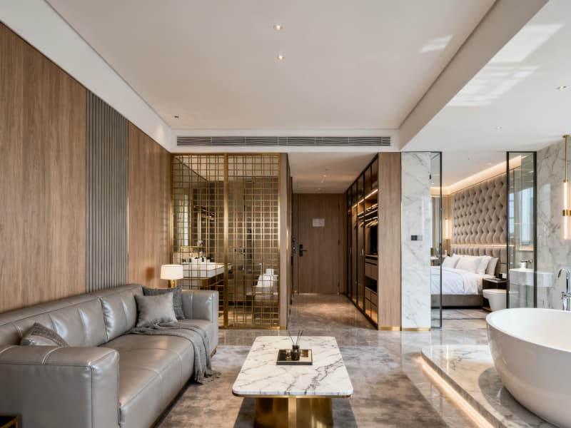 在空間布局上,充分利用4500平的開闊尺度,合理劃分大堂、客房、餐廳、宴會廳、健身中心等功能區域。各區域銜接順暢,既保證商務出行的高效便捷,又滿足休閑旅居的舒適體驗——例如標準客房注重實用性與靜謐感,行政套房強化尊貴感與功能性,宴會廳兼顧多元場景適配,健身中心與茶吧則豐富旅居生活維度。