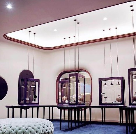 對燈具的選擇上,要顯得十分大氣。珠寶擺放在桌面凸出的圓柱形空心容器中。同時