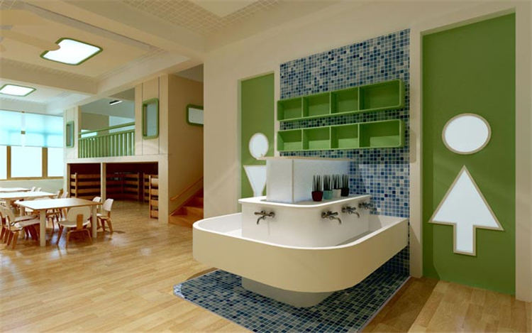 洗手區(qū)域的設(shè)計(jì):此處通往的是就餐區(qū),在洗手池的設(shè)計(jì)上,設(shè)計(jì)師對(duì)地面、洗手池都做了處理,目的就是為了避免因?yàn)樗斐傻牡孛鏉窕瑑蓚€(gè)門(mén)一個(gè)進(jìn)一個(gè)出,設(shè)計(jì)是希望可以從小培養(yǎng)孩子排隊(duì)的意識(shí),一進(jìn)一出之間也見(jiàn)證了教育的重要性。