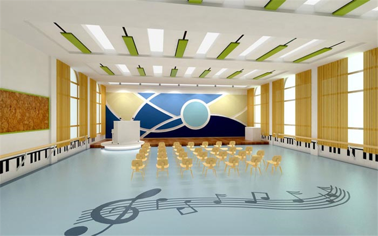 表演區(qū)域的設(shè)計(jì):這是最后一個(gè)音樂(lè)教室,但是這個(gè)教室在屬性上與前兩個(gè)稍有不同,在滿足音樂(lè)教室的同時(shí),也滿足表演的需求,設(shè)計(jì)師希望每一個(gè)孩子都是一個(gè)表演家,在臺(tái)上可以盡情的表演,培養(yǎng)每一個(gè)孩子表演、演講的能力。