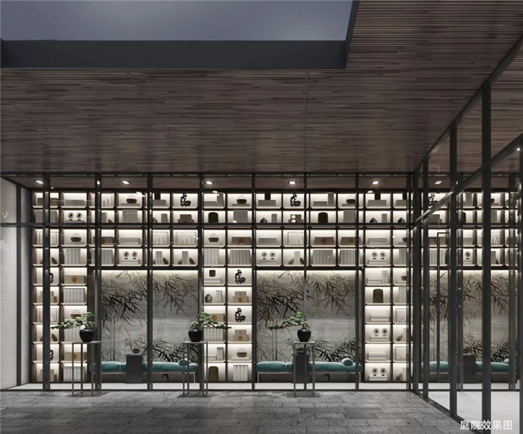 傳統與現代的融合變通,通過汲取傳統徽派的木構斗拱、瓦片、留白的山墻和民居的水墨意境,運用新的材料進行演繹,如水磨石的地面、背景墻藝術圖案結合金屬網、半透的夾絲玻璃、黑色的金屬構建.以寫意的方式提取徽州的意境,延續徽派建筑的黑白兩色,再點以中國傳統色系軟裝搭配,表達了設計對傳統的回歸和未來的展望.