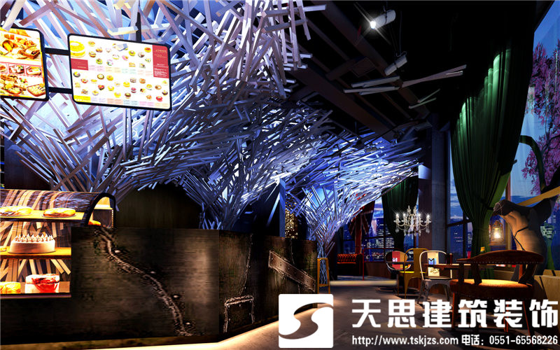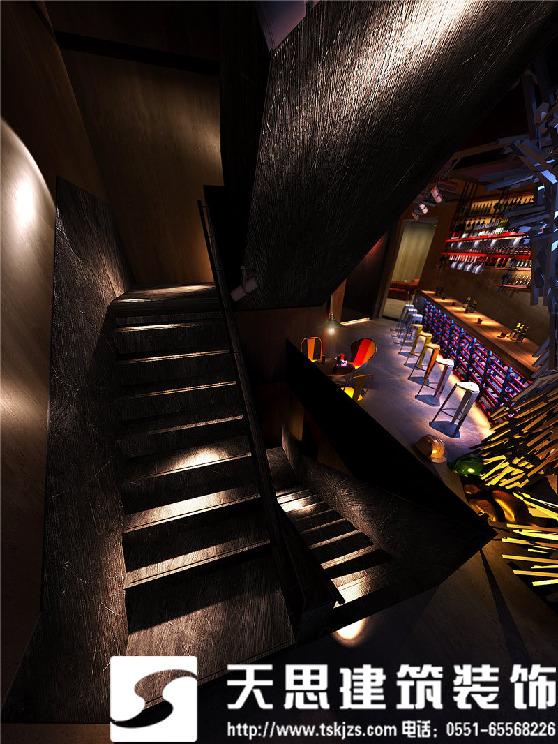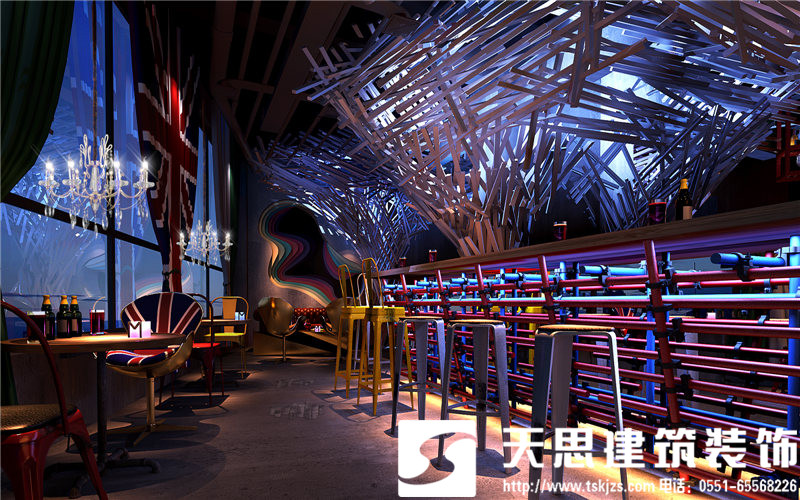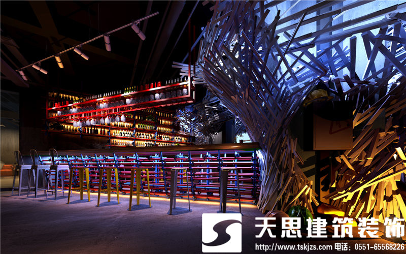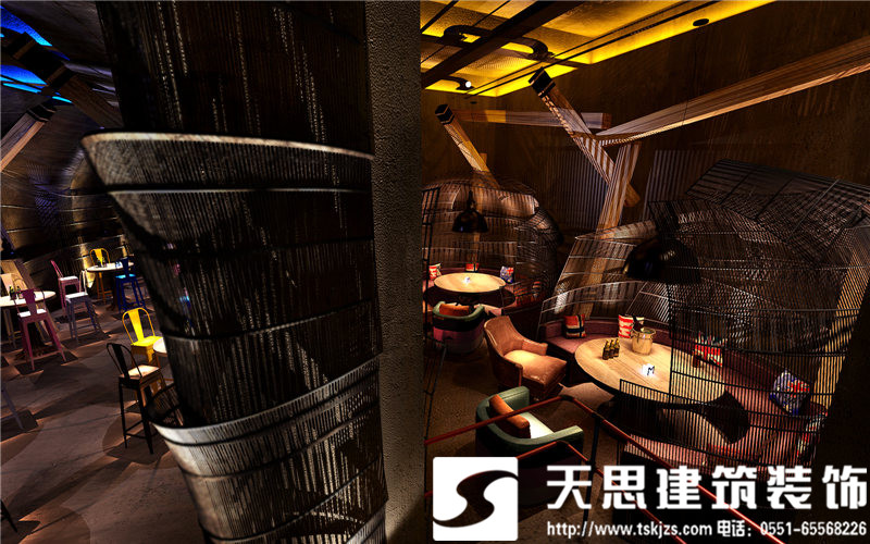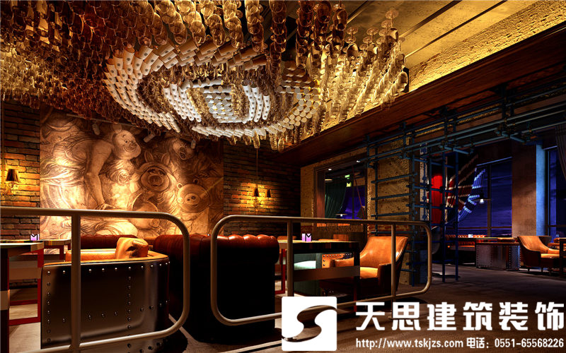 一層吧臺處,方鋼構建的造型樹自由,飄逸,充滿藝術張力。鋁制吧臺搭配特制的建筑腳手架座椅,工業范兒十足,還原了建筑的純粹美感。鋼板樓梯處用射燈做呼應,浪漫且工業氣息濃郁。通道處,玫瑰金鋼板勾勒的點點星光自由浪漫,展現了工業元素的獨有魅力。包間,原有紅磚墻處理后的墻面中性硬朗,鐵網做成的遮擋裝飾飄逸自由,營造的私密效果恰到好處。玻璃上的手繪勾勒出包間裝飾畫,讓視角多了一絲抽象派的趣味。