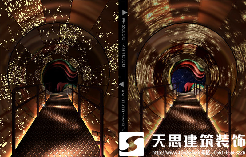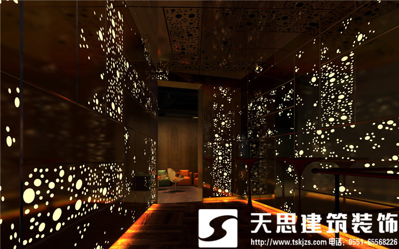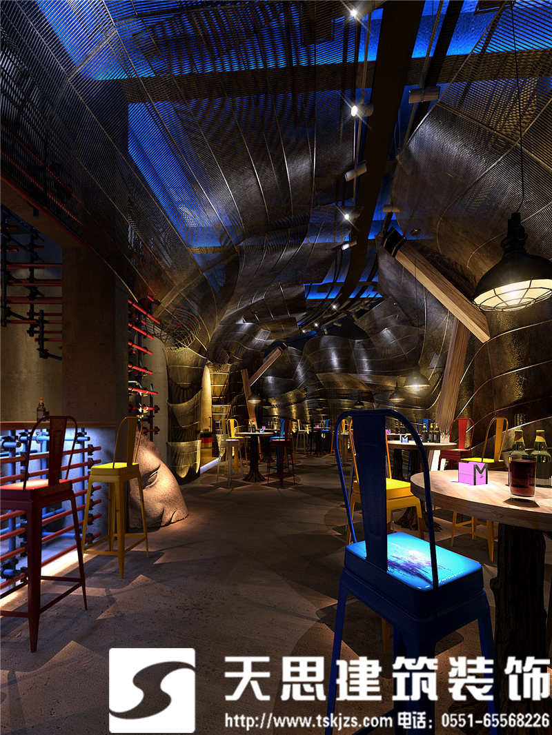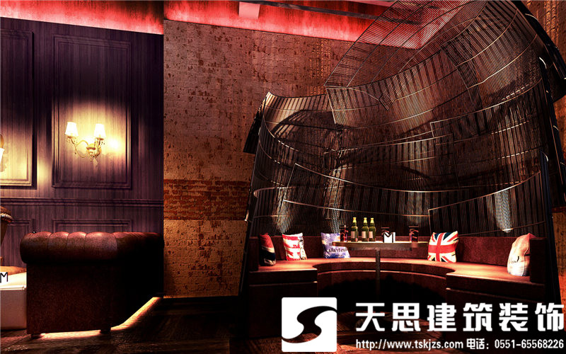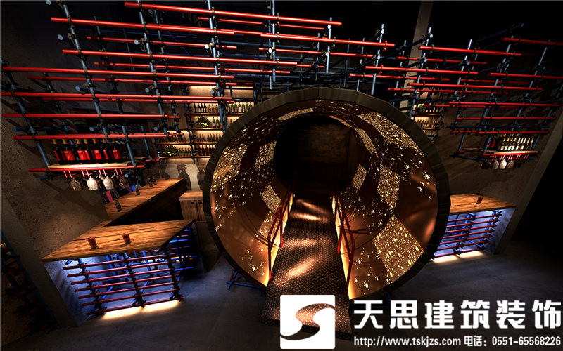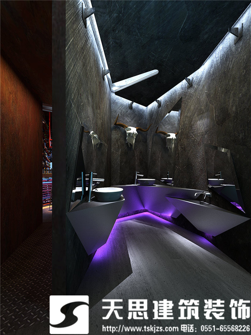小型吧凳簡單時尚,自然隨意。墻面勾勒的紋理線條,讓空間藝術感爆棚。地下通道仿若一個旋轉型的空間隧道,神秘浪漫。鐵網拱形口又是一種最簡單的表達。洗手間,金屬質感的墻面和藝術品裝飾,簡潔時尚。鋁制洗手臺搭配淡淡的紫色光源,美輪美奐。
