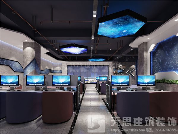 合肥網(wǎng)咖設(shè)計(jì)裝修的一般風(fēng)格: 綜合運(yùn)用幾何圖案、造型、材質(zhì)、色彩、飾物等手段,設(shè)法營(yíng)造一種在家上網(wǎng)無(wú)法體驗(yàn)的環(huán)境氛圍,讓上網(wǎng)者體驗(yàn)到或清新明快、或典雅莊重、或閑適淡