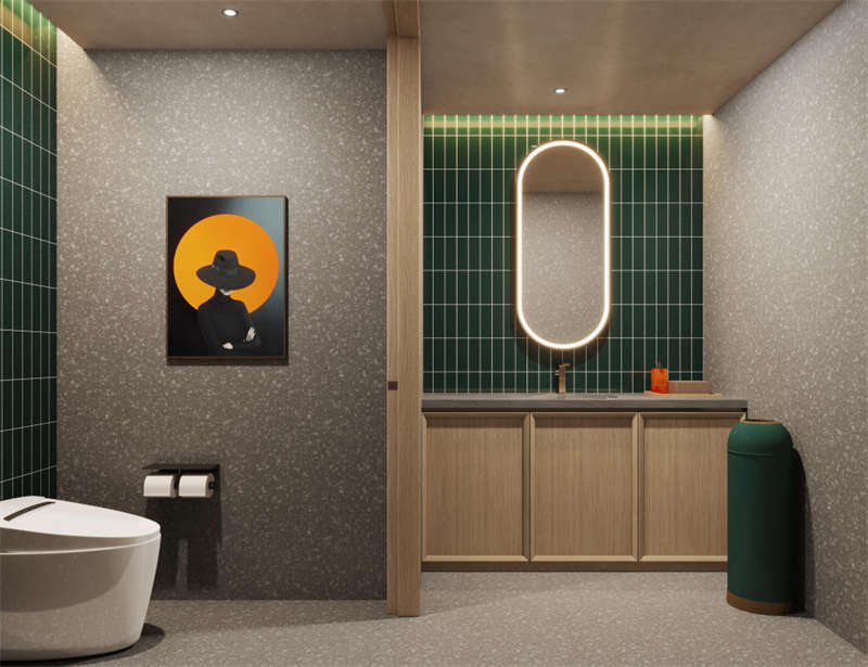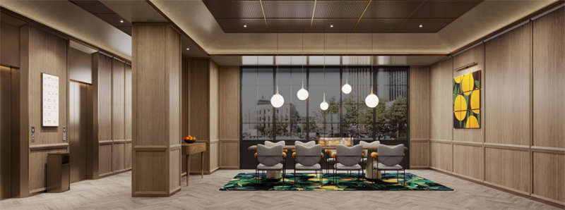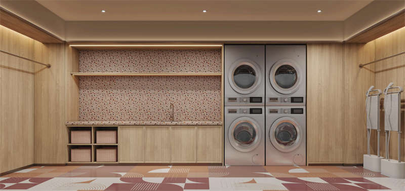 健身房、洗衣房和會議室旨在滿足游客的多功能需求。同時,它們的設計也與空間風格和視覺美感相對應。統一的木飾面作為空間底座,運動紋地膠和定制彩紋點綴健身房的生機與活力。精致的水磨石桌面、咖啡乳膠漆和方形形式的活力圖案地膠為洗衣房增添了柔和感,而開放式會議室的簡約風格則是綠色墻布和定制的博龍地毯的產物。