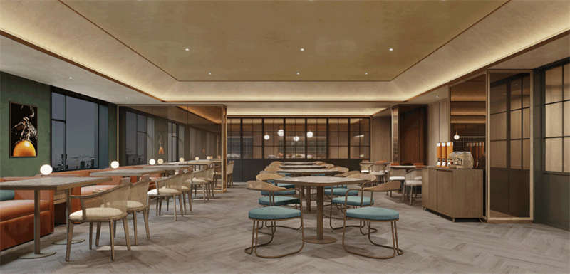 在歡快的爵士樂曲調中,捕捉到美式復古鄉村風格,以空間意向為早餐餐廳拉開生活的帷幕。延續橙綠色過渡與碰撞的軟裝飾基調。以熱帶植物為基調的藤桌椅,在溫和的木飾面與保平特種藝術漆相結合的空間背景下,營造出舒適的感官體驗。墻上掛著爵士鄉村樂隊的照片,營造出一種藝術氛圍。在享受美食的同時,也能在微妙的空間層次感中獲得不錯的體驗。