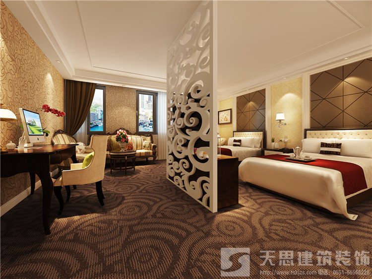 合肥酒店賓館裝修——客房細節 酒店賓館客房裝修的好壞,可以直接反映出酒店賓館的水平,客房空間布局要做到平淡無奇,穩中求勝。床是客房中的主角,床的位置很大程度上決定了空間的設計。客房細節如下: