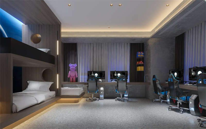 電競酒店不同于網吧的一點就是環境舒適,安靜不嘈雜,體感更舒適,由于空間隱蔽,隱私性和自由度更高一些,這些的要求需要在室內設計的環節中有所呈現。