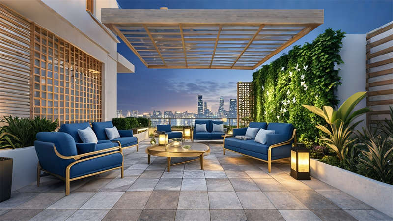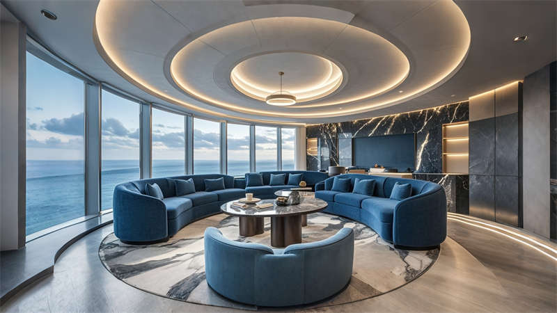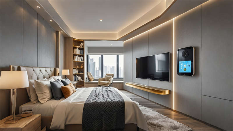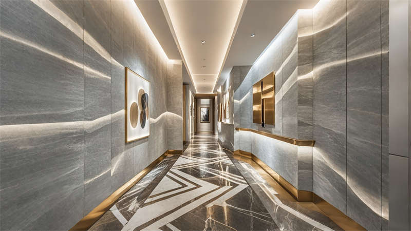 色彩體系以香檳金與深海藍為主調,大堂采用香檳金金屬線條勾勒建筑肌理,搭配深海藍大理石營造視覺重心。客房區運用暖灰硬包墻面平衡色彩強度,通過2700K暖光與4000K中性光分區照明塑造晝夜場景。材質組合注重層次:大理石地面、金屬構件、絨布軟包形成質感三部曲。
