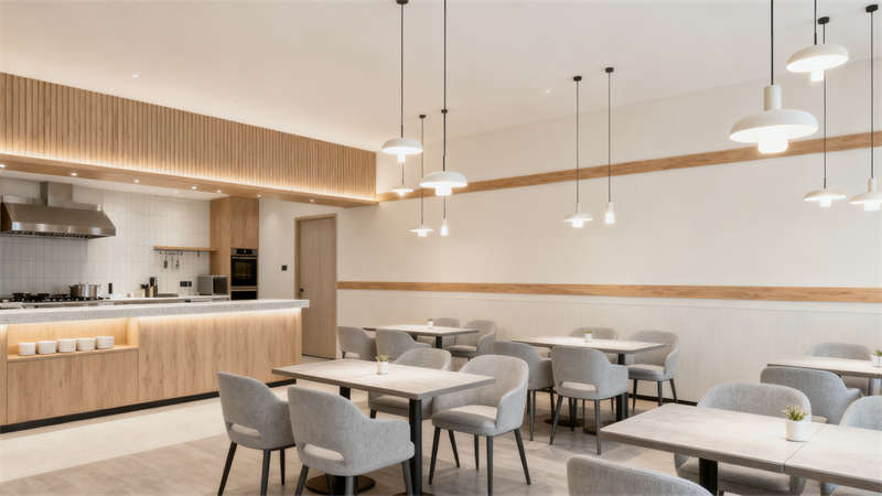 餐廳區域設計簡潔而富有質感,燈光設計巧妙,既保證了充足的照明,又營造出溫馨的用餐氛圍,桌椅擺放合理,留出足夠的活動空間,讓住客能在舒適的環境中享受美食。?