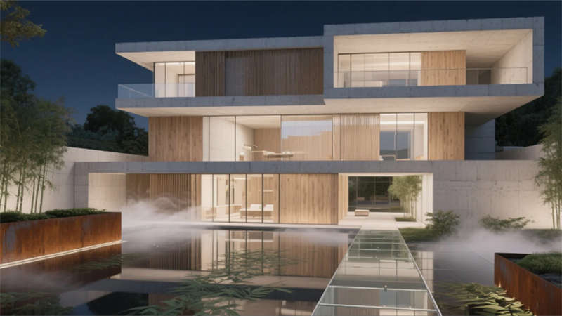 穿過懸浮玻璃步道,下沉庭院以枯山水礫石為紙,霧森系統(tǒng)織就流動的薄紗,銹鋼板花壇中蕨類舒展,嵌入式篝火躍動的暖光與冷調(diào)混凝土碰撞,喚醒人對原始自然的感知。挑高的大堂內(nèi),混凝土旋轉(zhuǎn)樓梯切割空間,透光云石墻面在晨昏光線中暈染出水墨質(zhì)感,線性光帶如星軌劃過,將窗外竹影引入室內(nèi)敘事。