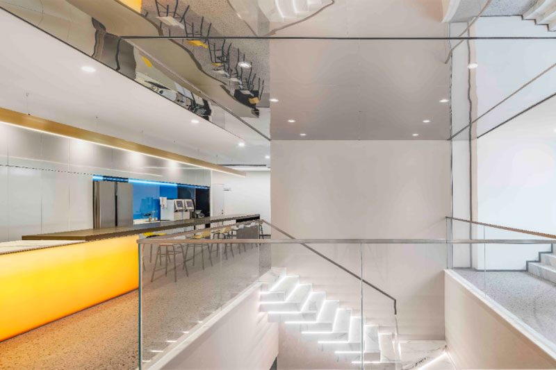 沉浸式體驗(yàn)人與空間交互,茶水區(qū)通過鏡面天花反射,光影在立體空間中流動(dòng),超動(dòng)感空間氛圍就此而生,板塊的不斷更新為它帶來(lái)永不停歇的活力,這里是“巨人”的世界。