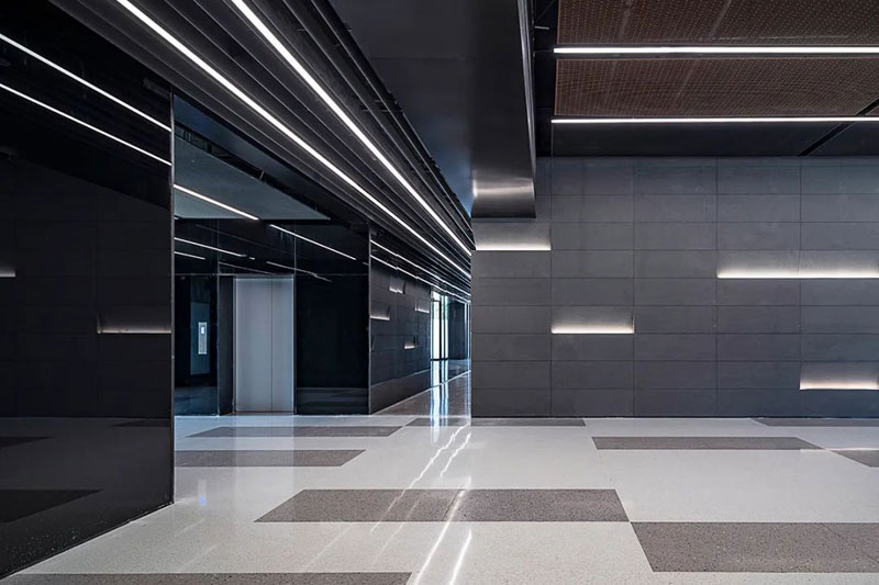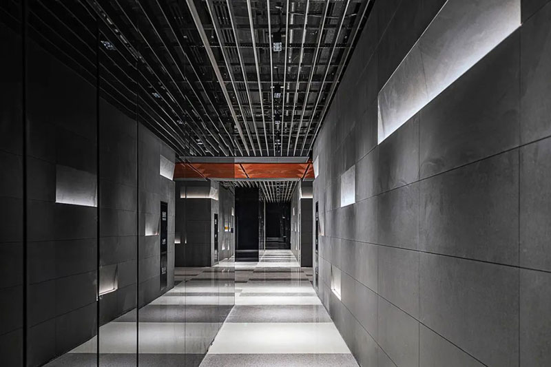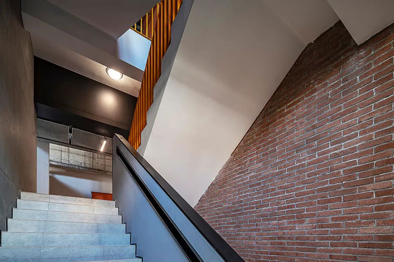 室內(nèi)空間造型多以棱角分明的幾何形體為主,減少裝飾類細部,鐵銹褐、水泥灰、煙熏黑等暗冷色調(diào)元素交織在一起。局部通過紅磚作為點綴,減少淺色系材質(zhì)的使用,讓自然光線將空間變得更有質(zhì)感。
