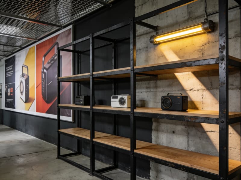 產(chǎn)品展示區(qū)則打破傳統(tǒng)廠(chǎng)房的單調(diào),采用木質(zhì)與金屬結(jié)合的展示架,背景墻以大幅的產(chǎn)品海報(bào)裝飾,營(yíng)造出專(zhuān)業(yè)且具吸引力的展示空間。