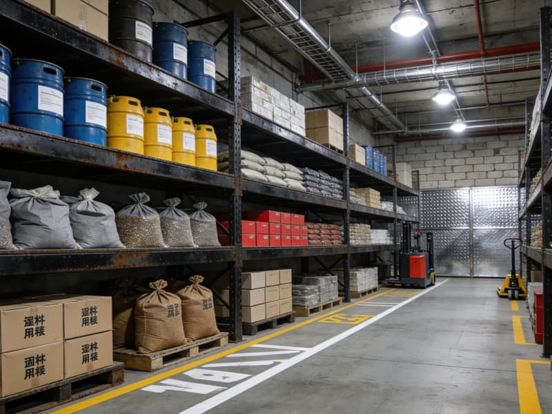 原料存儲(chǔ)區(qū)設(shè)置多層式的金屬貨架,方便分類(lèi)存放不同原料,提高空間利用率。區(qū)域間通過(guò)清晰的標(biāo)識(shí)線(xiàn)進(jìn)行劃分,保障物流運(yùn)輸?shù)捻槙场?