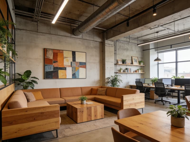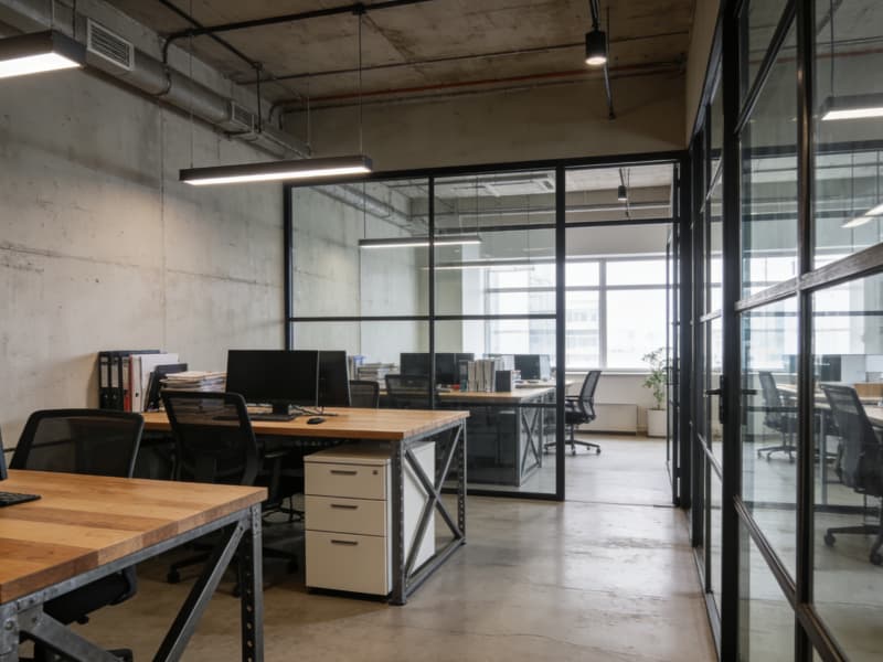 辦公區(qū)延續(xù)工業(yè)風(fēng)格,辦公桌選用金屬框架搭配木質(zhì)桌面,文件柜簡(jiǎn)約實(shí)用。通過(guò)玻璃隔斷劃分不同的辦公區(qū)域,既保證獨(dú)立空間,又不影響整體通透感。