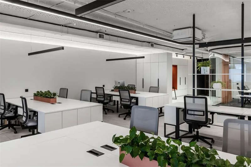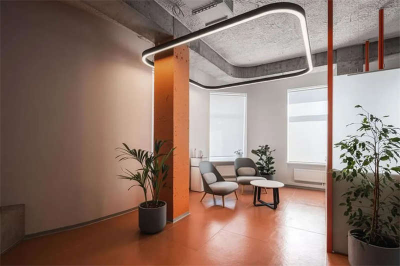 一種是沿辦公室周邊設(shè)置了一圈燈帶,燈光從白色天花板上反射出來,散發(fā)出令人賞心悅目的溫暖漫射光。還有一種線性照明形式呼應(yīng)流線型的建筑輪廓,將整個辦公室從入口區(qū)域連接到行政工作區(qū)。另一個這樣的設(shè)計元素出現(xiàn)在廚房區(qū),當(dāng)陰天自然光不足時可以照亮這里的空間。此外,每組工位都有一個獨立光源,如有必要,每個員工都可以自行打開或關(guān)閉。