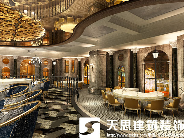 在西餐廳裝修過程中,包括走廊立向,西餐廳的墻面裝修等都是形成空間環(huán)境氣氛的重要元素,它們的造型在形式上應比較自由,避免對稱式構(gòu)圖,對一些形式美的原則則可以突破,給人以強烈的視覺沖擊,在界面材料的運用上也可別出心裁,給人眼睛一亮之感。這就是裝修的創(chuàng)造性。