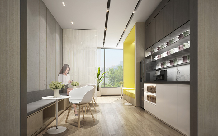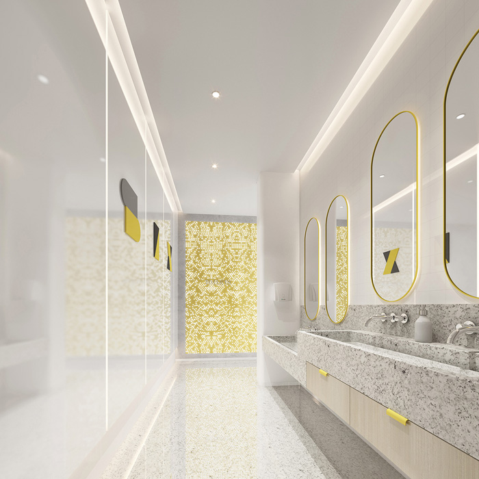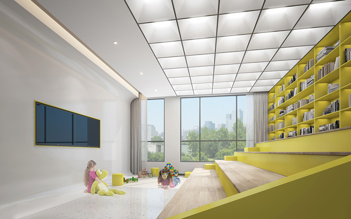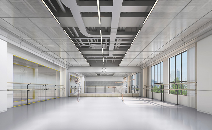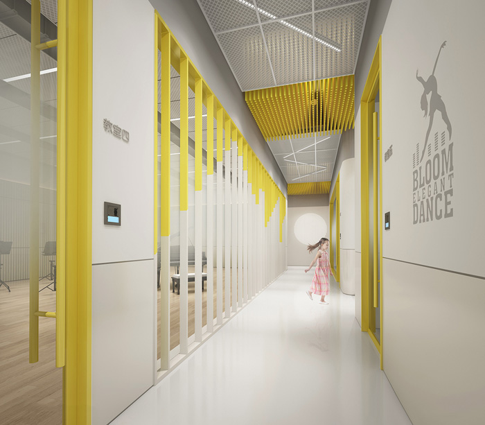 此處藝術(shù)學校設(shè)計中,告別了五彩斑斕的顏色,突出了空間的簡潔與干凈,用黃色做為點綴色提升空間的趣味性。
