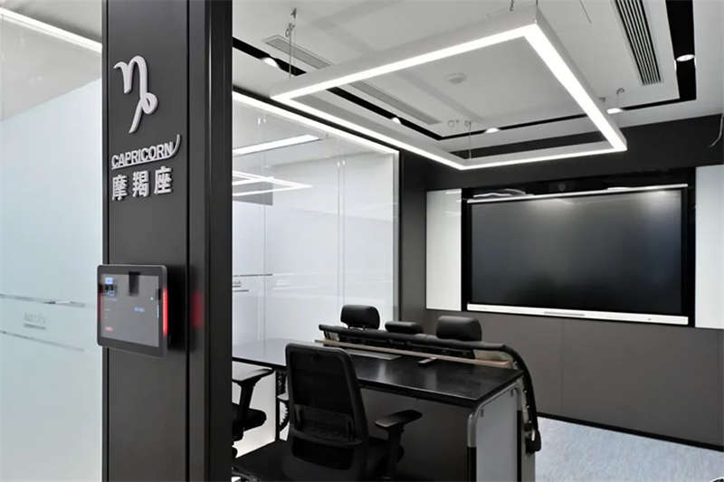 在接待前廳左右兩邊各設(shè)置了一個大會議室,其中一個是現(xiàn)代酷灰的可二合一的會議室,另一個是穩(wěn)重優(yōu)雅的行政會議室。感謝成品隔斷供應(yīng)商卡萊斯卓的緊密配合和支持,在設(shè)計師的要求下,把LED燈帶嵌入了雙層玻璃隔斷中。讓整個會議室區(qū)域看上去充滿科技感!