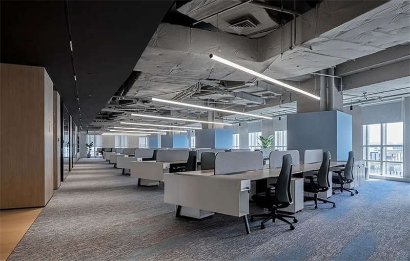 穿過會議區進入開放辦公區闊然開朗,色調由黑變淺,層層律動的地面紋理將蔚藍海洋天空的自然氣息引入到空間,律動的線性燈光交織輝映描述了Arm科技之源越過海洋略過山川的偉大之旅,植物和木色的點綴讓空間賦予對自然和科技的尊崇和平衡。