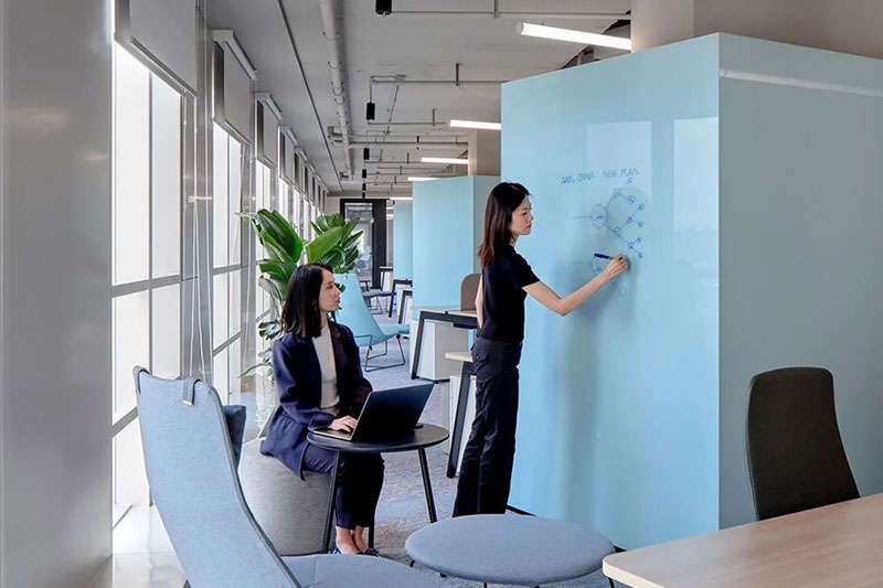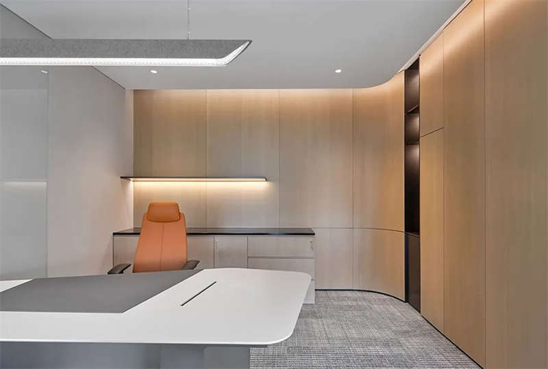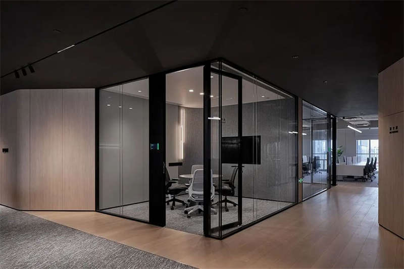 進入會議空間,設計師刻意控制它的視覺張力,前區的體驗得以延續,灰黑色調覆蓋目力所及并引入更多的柔性材料,專業、專注是會議空間的功能立本但也不乏我們對活力元素的照拂,每一個會議室我們都選擇了形式各樣的藍色地毯來裝點。