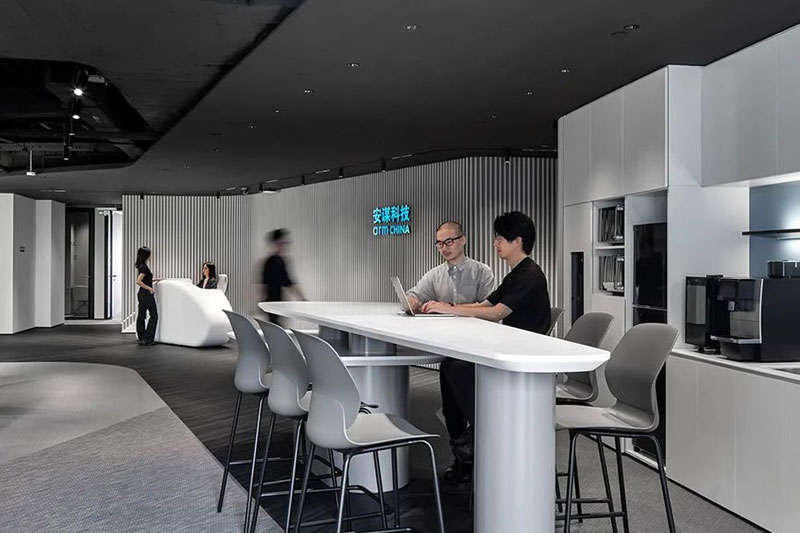 入戶的觀感尤為純粹,由一面數碼互動墻將視覺由電梯廳引入內部,極致的暗調勾勒出明快的線性淺灰色logo墻并有向上延伸之感,自發光logo猶如秘境中的湛藍熒光寶石恬靜而自信的展現自我,黑色Bolon毯紋理隨著視覺的變化不斷變幻伴隨空間動線,將訪客緩緩引入內場直達休憩區,猶如數字科技傳動向前并引領未來。此處形式多樣的家具配合綠樹盈動,構造了訪客和員工之間交融和平衡的靈動空間。