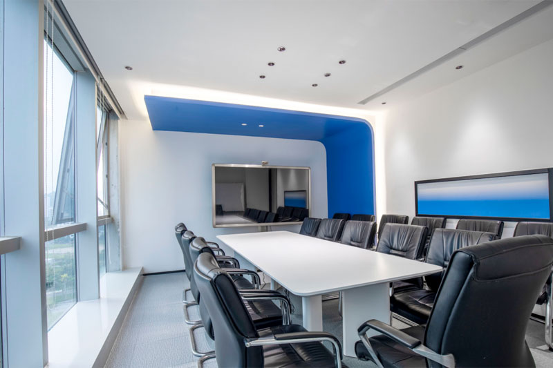 大小會議室都延續(xù)了空間的藍色基調,利用通透的藍色玻璃分隔過道,使空間更加通透明亮,不僅讓視感增強,也深刻的加強了品牌形象在訪客心中的作用。