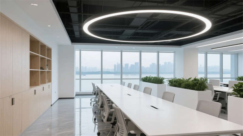 開放辦公區以模塊化綠植隔斷柔化邊界,智能會議艙曲面屏動態呈現江岸線,賦予協作以在地詩意。創意實驗室的可書寫玻璃墻與磁吸家具激發即興創造,而階梯沙龍區弧形燈帶如江水蜿蜒,引導思想交匯。