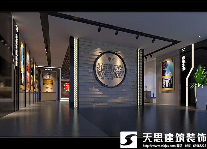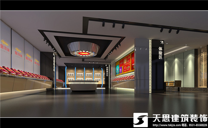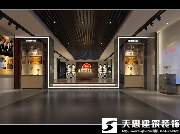 展廳是提高產品和企業品牌形象的場所,表達個性風格是這個空間的關鍵。金龍魚通過利用地面折線分割跑道的表現與背景形象的鮮明顏色相互配合產生強烈視覺沖擊效果,令人耳目一新,印象深刻。在其中部設計中,運用厚重的體量感,如半圓形及魚形,將所有的空間有機地聯系起來,長久、富貴、不可侵犯。